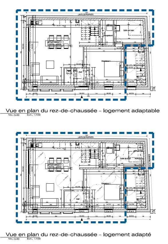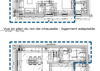 Duplex passif 4 chambres, adaptable. Le duplex en version adaptée comportera une unité de vie au rez-de-chaussée comprenant 1 chambre 2 personnes, sanitaires (salle de douche et toilette), salon et cuisine.